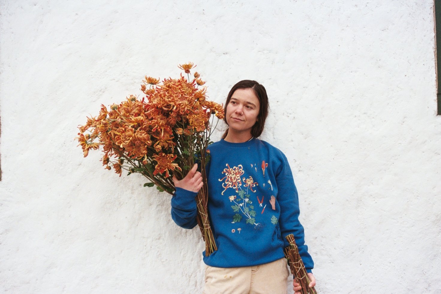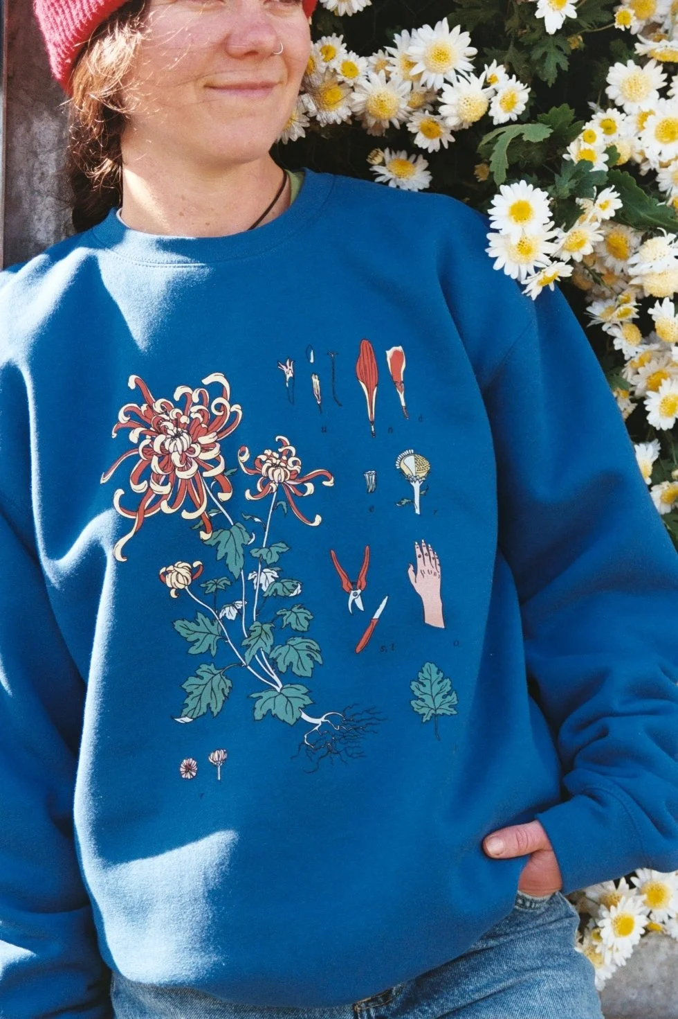 Hand illustrated botanical design by Vermont artist Lorna Dielentheis and printed onto heavyweight crew sweaters to celebrate the beauty and uniqueness of the heirloom Chrysanthemum.